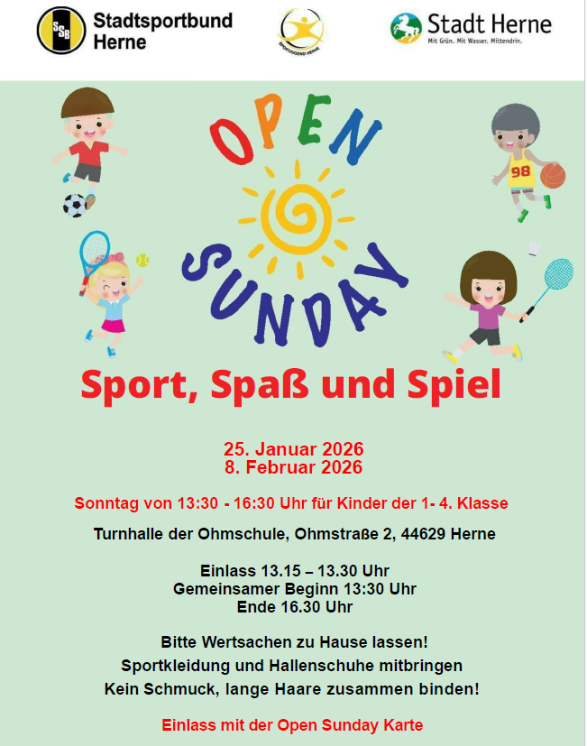 An ausgewählten Sonntagen dürfen die Schülerinnen und Schüler der 1.-4. Klassen in der Turnhalle an der Ohmgrundschule Sport machen. Die Veranstaltung wird von ausgebildetem, freundlichen Personal begleitet, ist sehr gut organisiert und finden von 13.30 Uhr – 16.30 Uhr statt. Es handelt sich dabei um ein außerschulisches Angebot des Sportbundes Herne und der Sportjugend Herne.
