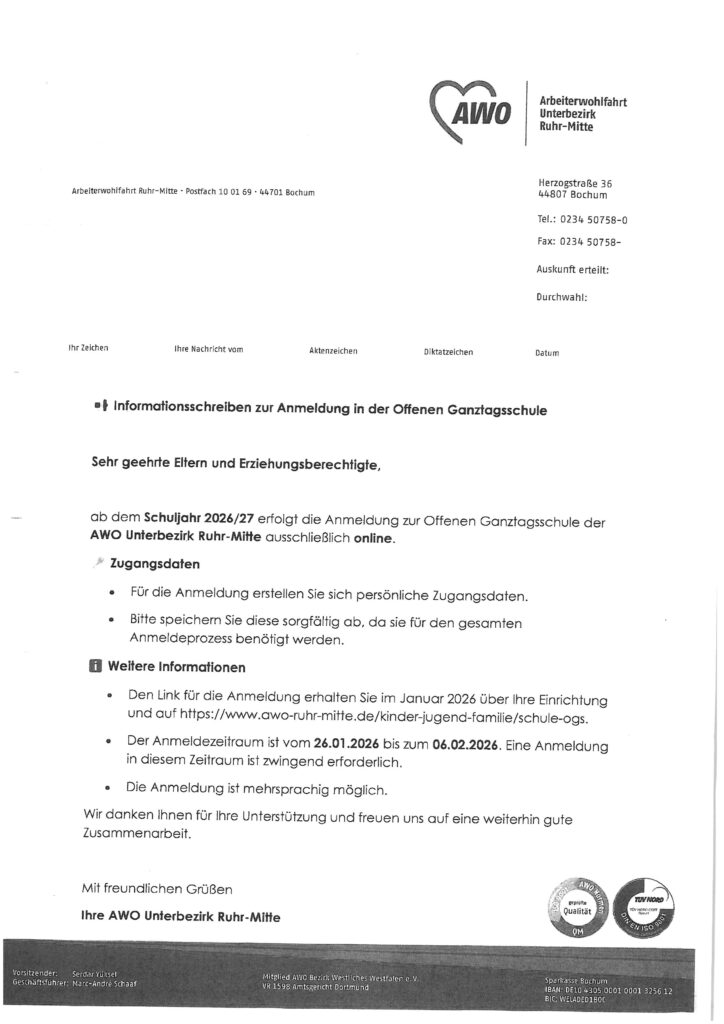Wenn Sie für Ihr Kind an einem Platz in der Offenen Ganztagsschule (OGS) im Schuljahr 2026/2027 interessiert sind, beachten Sie bitte die folgenden Informationen: