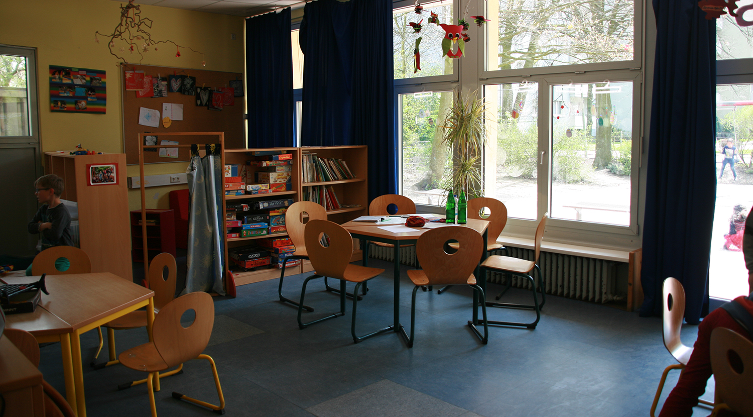 Unsere OGS hat ein eigenes Gebäude und einen eigenen Außenbereich auf unserem Schulgelände. Im OGS-Gebäude gibt es einen Spiel- und Bastelraum mit abgegrenzter Ruhezone („Traumland“), einen Speiseraum, einen Gaderobenraum, eine Küche sowie einen Waschraum mit Toiletten. In der folgenden Galerie können Sie sich einen eigenen Eindruck über unsere Räumlichkeiten verschaffen.